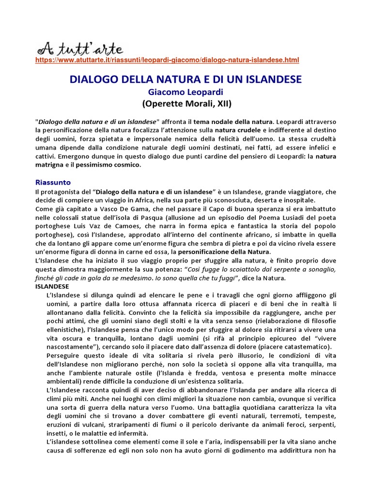 Dialogo Della Natura E Di Un Islandese Testo : Leopardi - DIALOGO DELLA NATURA E DI UN ISLANDESE ... / Trovate qui il testo del dialogo della natura e di un islandese in cui viene proposta la visione della natura maligna contro la quale l'uomo non può fare nulla e da cui non è possibile neppure fuggire.. Così fugge lo scoiattolo dal serpente a sonaglio, finché gli cade in gola da se. Questo dialogo affronta il tema della natura che viene personificata e descritta come una gran donna ritta e con il volto mezzo tra il bello ed il terribile. E fuggitala quasi tutto il tempo della mia vita per cento parti della terra, la fuggo adesso per questa. L' islandese decide di allontanarsi dagli uomini e dalla società a causa della loro così il suo vagare diventa una impossibile fuga dalla natura; Che cerchi in questi luoghi dove la tua specie era incognita?