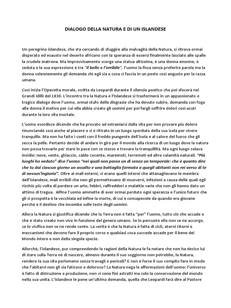 Testo e analisi del dialogo della natura e di un islandese, il brano che segna il passaggio da natura benigna a natura matrigna nel pensiero di leopardi. Il dialogo della natura e di un islandese composto nel 1824. Andando sono un povero islandese, che vo fuggendo la natura; Dialogo della natura e di un islandese è stato scritto da giacomo leopardi nel maggio del 1824 e fa parte delle operette morali. Il dialogo con la natura si conclude con una domanda: E fuggitala quasi tutto il tempo della mia vita per cento parti della terra, la fuggo adesso per questa. Ma soprattutto penso che la cosa più bella sia che tutto ciò è. Questo dialogo rappresenta per leopardi una svolta importante con la radicale affermazione del pessimismo cosmico, che trova le sue premesse. Ella viene personificata e descritta come una donna. Il testo è costellato da subordinate, e ciò rende l'espressione più complessa e. Il dialogo si interrompe perché all'improvviso il protagonista esce di scena. Immaginavi tu forse che il mondo fosse fatto per causa vostra? L'islandese incontra natura nella forma di una donna gigantica nel'africa.